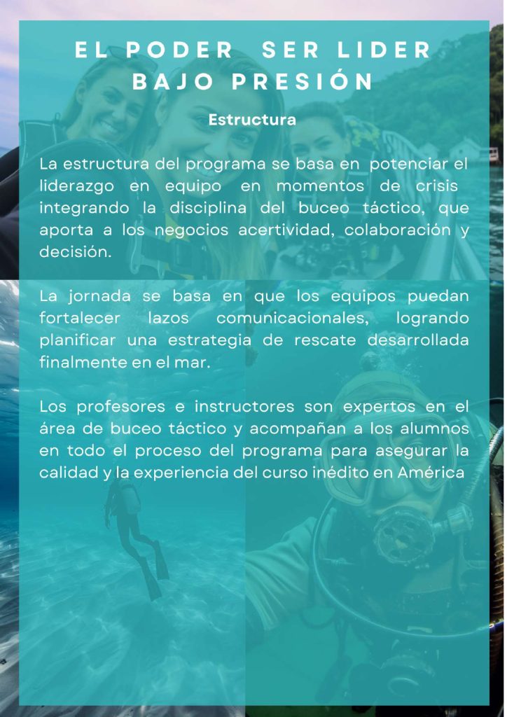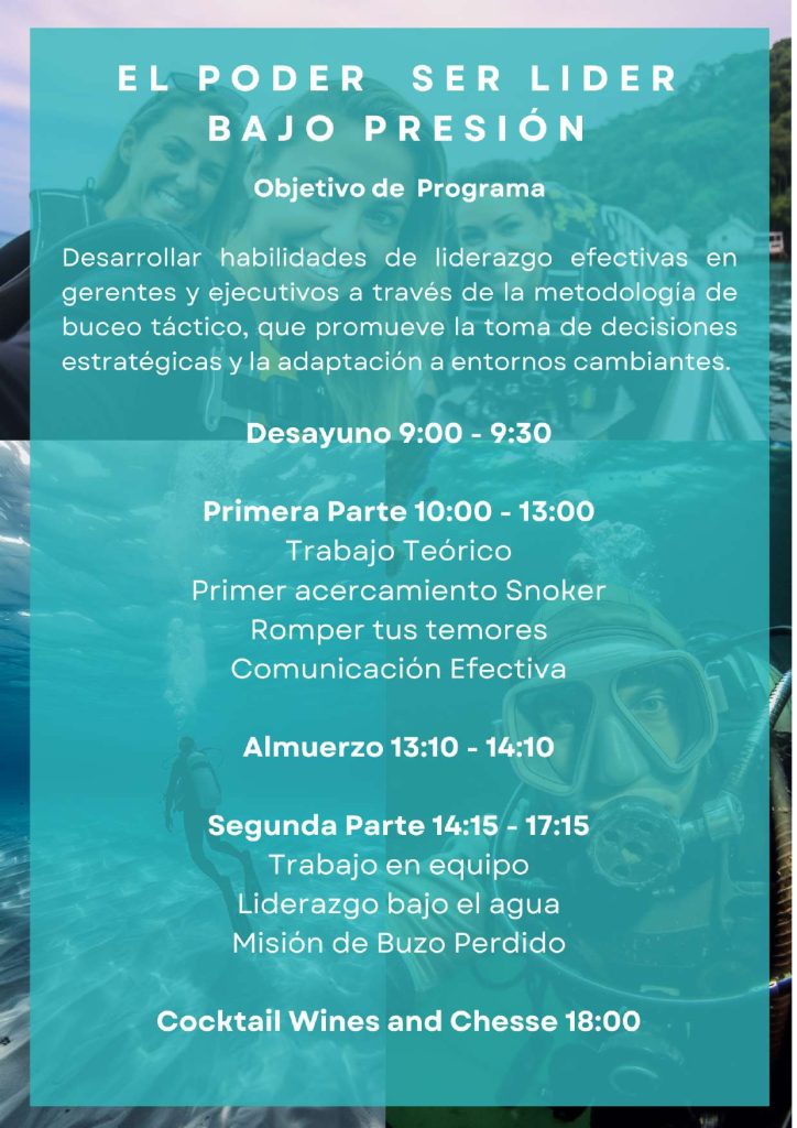 Estas actividades se desarrollan principalmente en entornos naturales como Algarrobo u otras localidades costeras de la Quinta Región de Valparaíso, donde el mar se convierte en un escenario real de transformación. Lejos del entorno habitual de oficina, los participantes enfrentan desafíos compartidos en un contexto grupal que fomenta la confianza, la colaboración y el pensamiento estratégico. Esta experiencia no solo fortalece vínculos entre líderes y equipos, sino que también permite observar y entrenar competencias clave en tiempo real: adaptabilidad, gestión emocional y liderazgo situacional. Cada jornada de buceo, diseñada con un enfoque metodológico claro, es una invitación a salir de la zona de confort y experimentar un aprendizaje significativo que perdura más allá del curso.